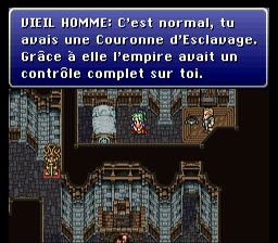 La fille va se retrouver couchée dans un lit devant un vieil homme qui lui dit qu’elle avait une couronne d’esclavage avec laquelle l’empire avait un contrôle sur elle. Après quelques paroles échangées, des gardes frappent à la porte pour récupérer la fille et l’armure Magitek. Le vieil homme va vous faire passer par derrière afin d’éviter les gardes, dirigez-vous vers l’Ouest, les gardes vont vous repérer, mais continuez votre chemin et entrez dans la grotte.