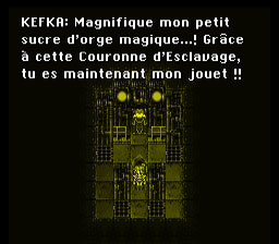 Seule, vous pouvez vous faire attaquer par des rats, tuez-les avec votre arme. Vous trouverez un point de sauvegarde un peu plus haut. Vous trouverez sur votre route un coffre, ouvrez-le, vous obtiendrez alors « Aile de Fenix » et un autre contenant « Sac de Couchage ». Les gardes finirent par vous rattraper mais par chance vous leur échappez en tombant dans un trou. Tourmenté par la chute, vous vous évanouissez. Vous vous remémorez alors le moment où Kefka vous a mit cette horrible couronne, et la présence de l’empereur Gestah.