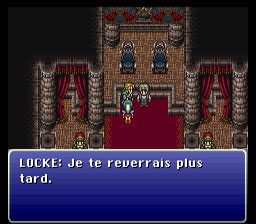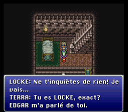 Après un petit discours il s’en va et vous contrôlez Terra, vous devez suivre Locke pour aller dans le bâtiment Est. Dans cette pièce Locke explique qu’il est chasseur de trésor, mais aussi il explique la concordance entre l’Empire et la Résistance.