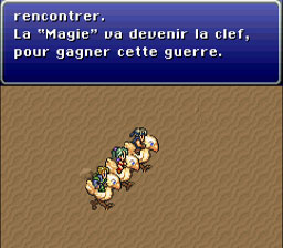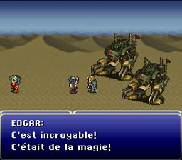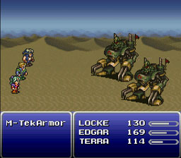 Edgar, Locke et Terra eux partent en chocobo. Kefka envoi des M-Tekarmor pour les rattraper, choses qu’ils arrivent à faire. Le combat commence alors. Dès que vous utilisez un sort magique avec Terra, Edgar se met dans tous ses états, ainsi que Locke un peu plus tard.