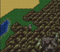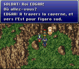 Une fois arrivé dans la genre de crevasse descendez du chocobo en appuyant sur la touche B puis entrez dans la grotte. Vous apercevez un soldat avec un chocobo.
